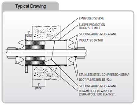 当火灾或蒸汽管线屏障的管道或导管发生移动时,安装在套管和管道上。